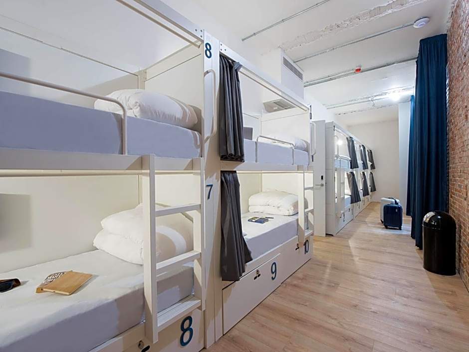 This single bed in a 10 bunk bed dormitory room has access to a shared bathroom.